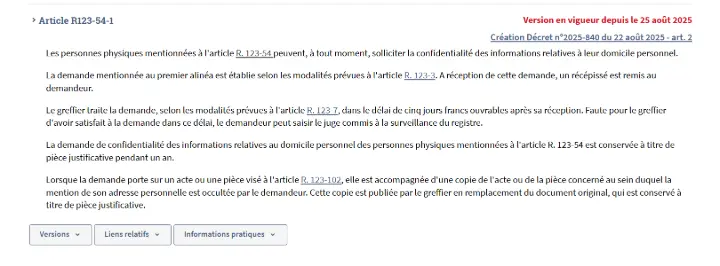 L'entrée en vigueur du décret 2025-840 du 22 août 2025 permet désormais à certaines personnes physiques de demander l'occultation (la confidentialité) de leur adresse personnelles dans ces registres.